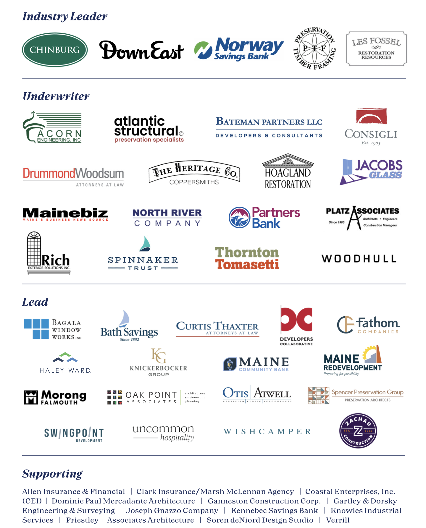 Photos credits, left to right, top to bottom: (1) Boyd Block – East Brown Cow; (2) The Spinning Mill – High Tide Capital; (3) Nightingale – Structure Media; (4) Gehring House – Scott Hanson; (5) Dr. Milton Wedgewood House – Christian Phillips; (6) Biddeford City Hall Clock Tower – Dom Lizotte, DLM Media; (7) Victoria Mansion – Victoria Mansion; (8) Wood Island Life Saving Station – Wood Island Life Saving Association; (9) The Tiller Project – The Tiller Project; (10) Carla Haskell – Matt Cosby, Maine Home + Design.